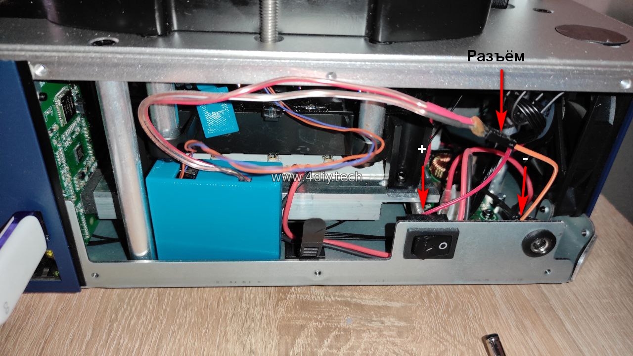 Питание устройства лучше подключать так, как указано на фото. Подключив плюс питания после выключателя принтера, получим возможность включения и выключения устройства вместе с принтером.